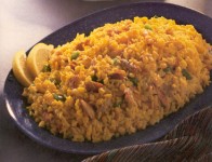 cover them with boiling water. Put the rice in a pan, cover with ¾ pint (450 ml) water and add the curry powder. Bring to the boil, and then cover tightly and simmer for 10 minutes. Stir in the pepper and sweetcorn and simmer for a further 10 minutes, when all the water should have been absorbed. Skin the mackerel, and fork the flesh into the rice. Stir in the yogurt. Turn onto a warmed serving plate and garnish with lemon wedges. |